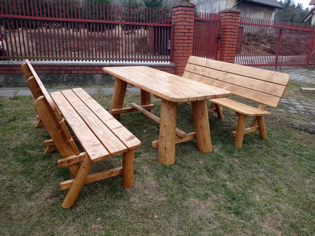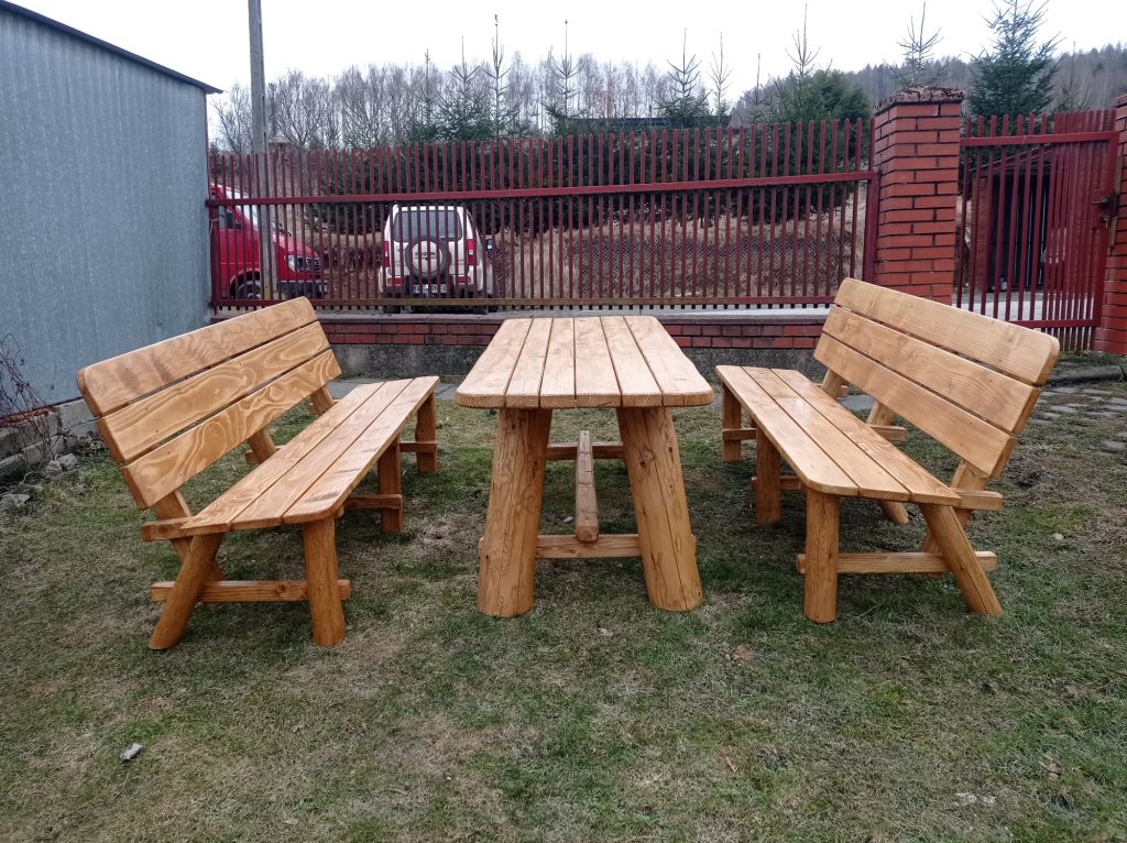 Zestaw ogrodowy w którego skład wchodzi stół i dwie ławy