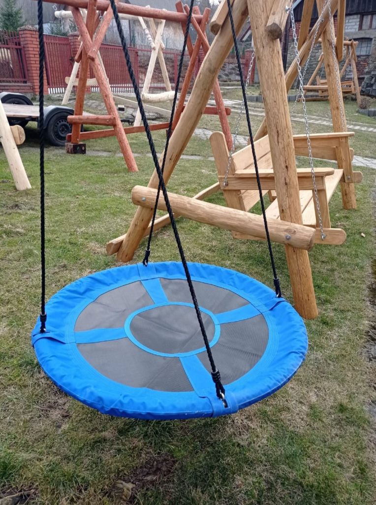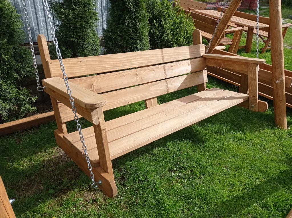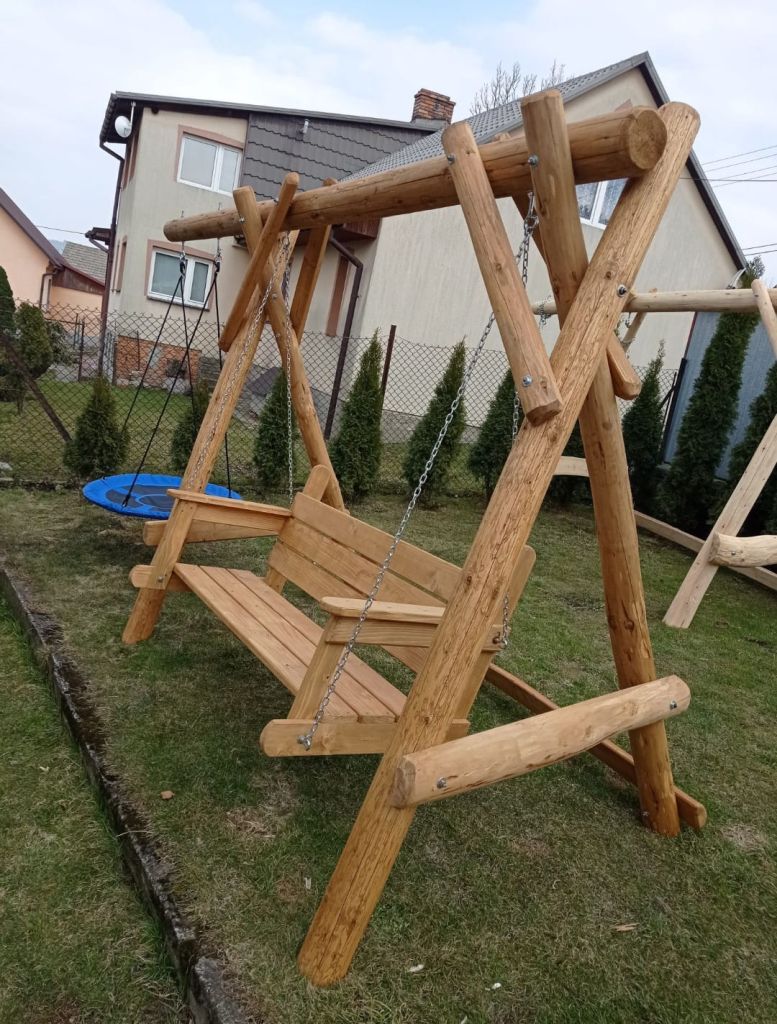 Huśtawka jodłowa, bardzo masywna, impregnowana drewnochronem z woskiem. Wymiary podstawy 300 na 150. Ławeczka zawieszona ma łańcuchu 6 mm(ocynk). Wymiary ławki to dł. 180 zm szer. 50 cm wys.50 cm !!! Jest możliwość zamówienia huśtawki z bocznym siedzonkiem dla dziecka do 50 kg